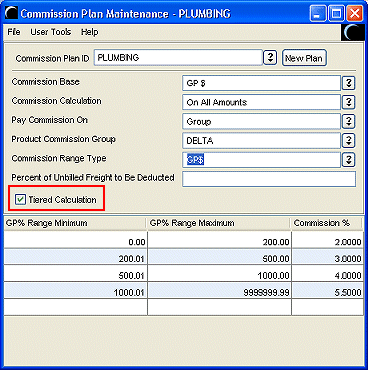The following example describes a commission earned from gross profit dollar (GP$) and calculated on GP$ for tiered calculations.