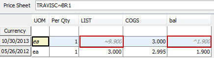 In Price Sheet Maintenance for the local price sheets, values inherited from the default price sheet display in gray, italicized text with a carrot preceding it. In Price Sheet Maintenance for default price sheets, values inherited by "looking backward" to the most recent effective price sheet display in gray, italicized text:
