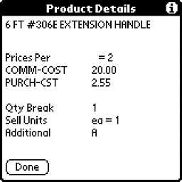 If you downloaded Reorder Pad information, that data also displays on the Product Details screen. The information is only as current as the last time the Palm device synchronized with the host system and updated Reorder Pad and Product File information: